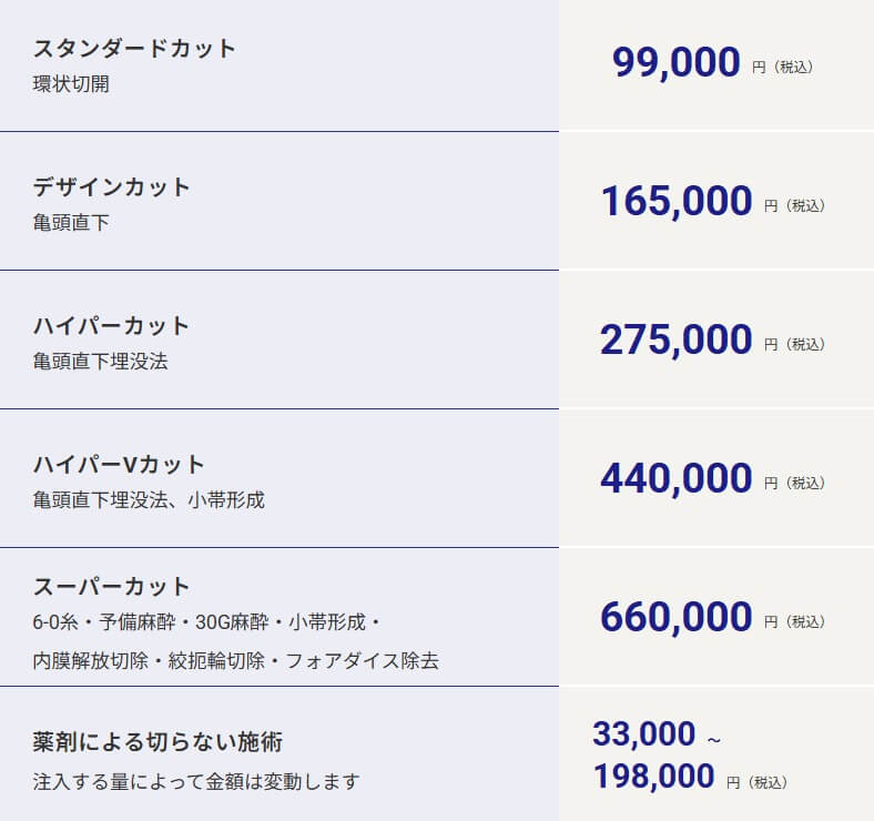 - 亀頭直下埋没法: 亀頭直下のラインで切除・縫合し、傷跡が目立ちにくく美容的にも優れるが、費用は高め。