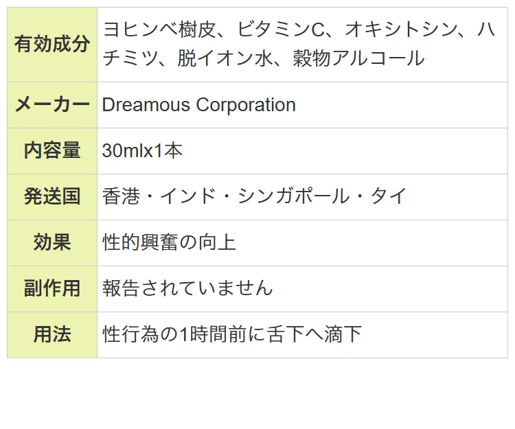 | 用法 | 性行為の1時間前に舌下へ滴下 |