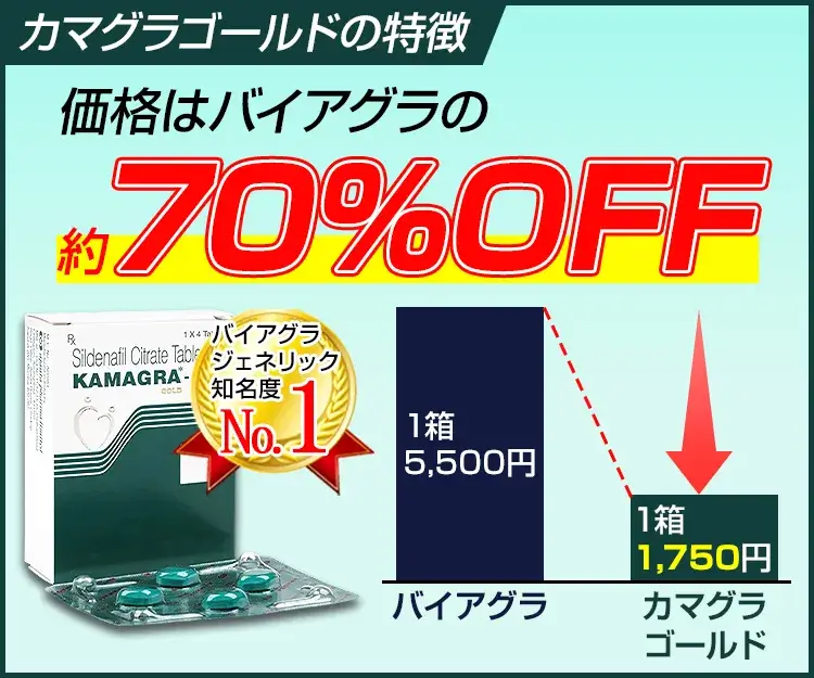 カマグラ(カマグラゴールド)は、バイアグラジェネリックの中でも特に人気・知名度が高く、安価に購入できるのが特徴です。
