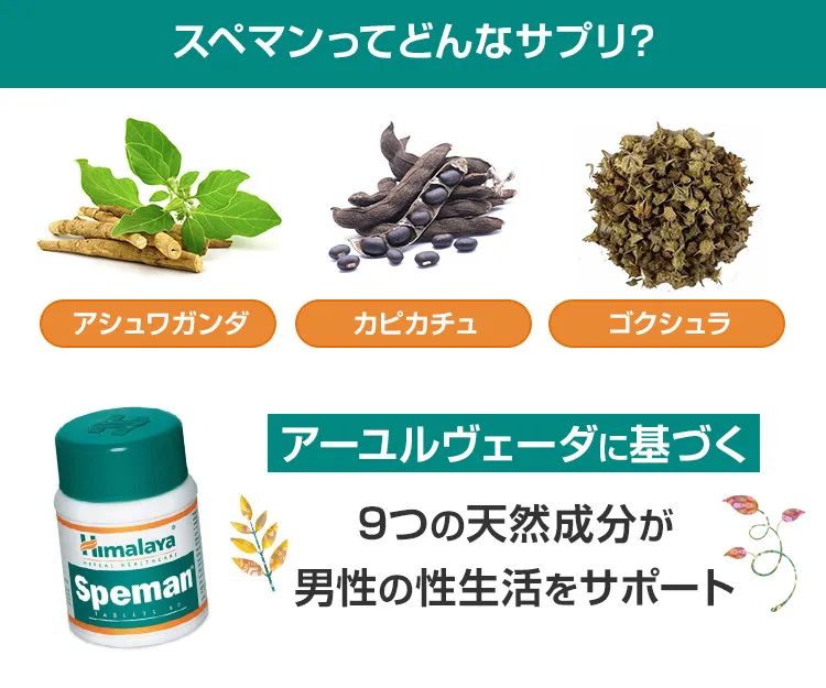 スぺマンは、心身の健康をサポートするとされるアシュワガンダ、男性ホルモン増強に役立つといわれるカピカチュやゴクシュラといった成分を配合したサプリメントです。男性機能回復、性欲向上が期待できます。